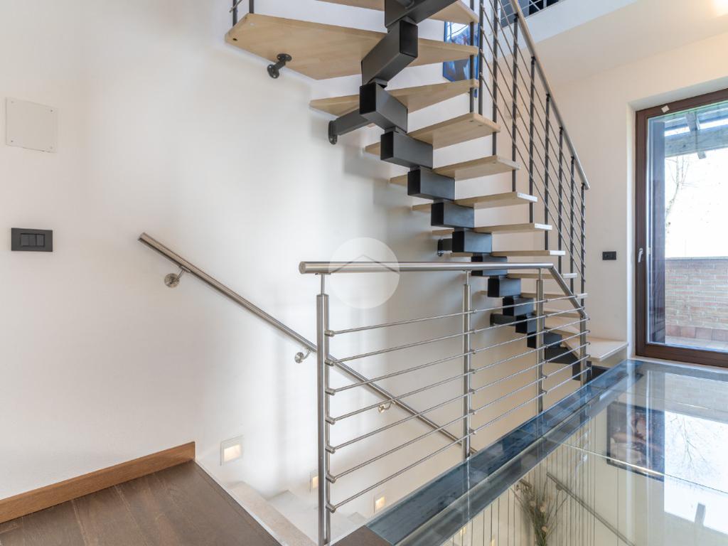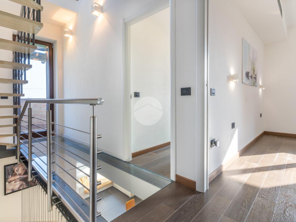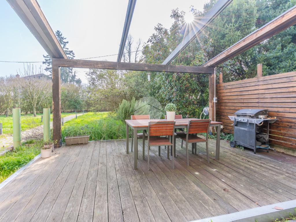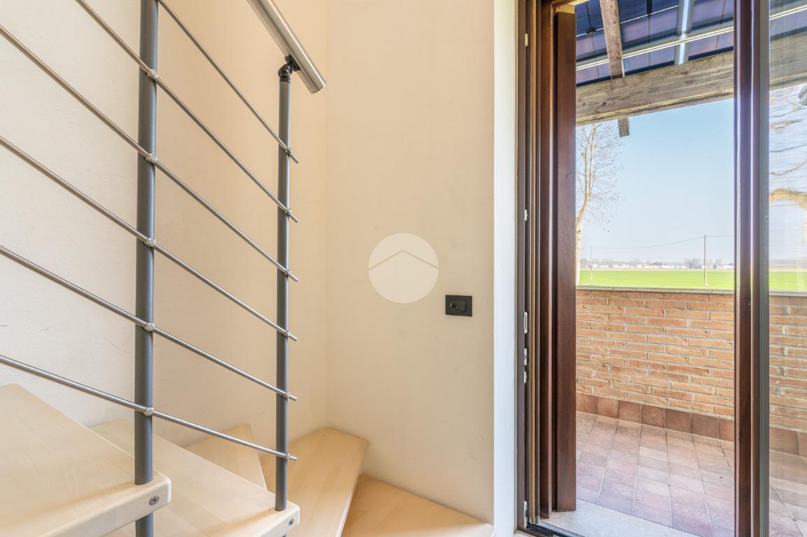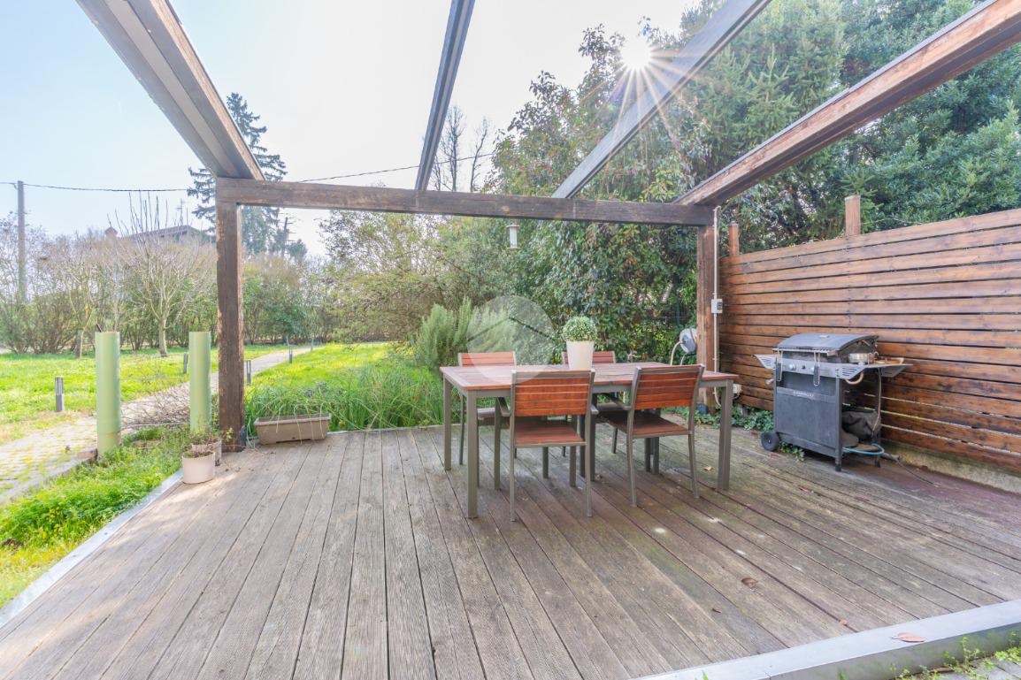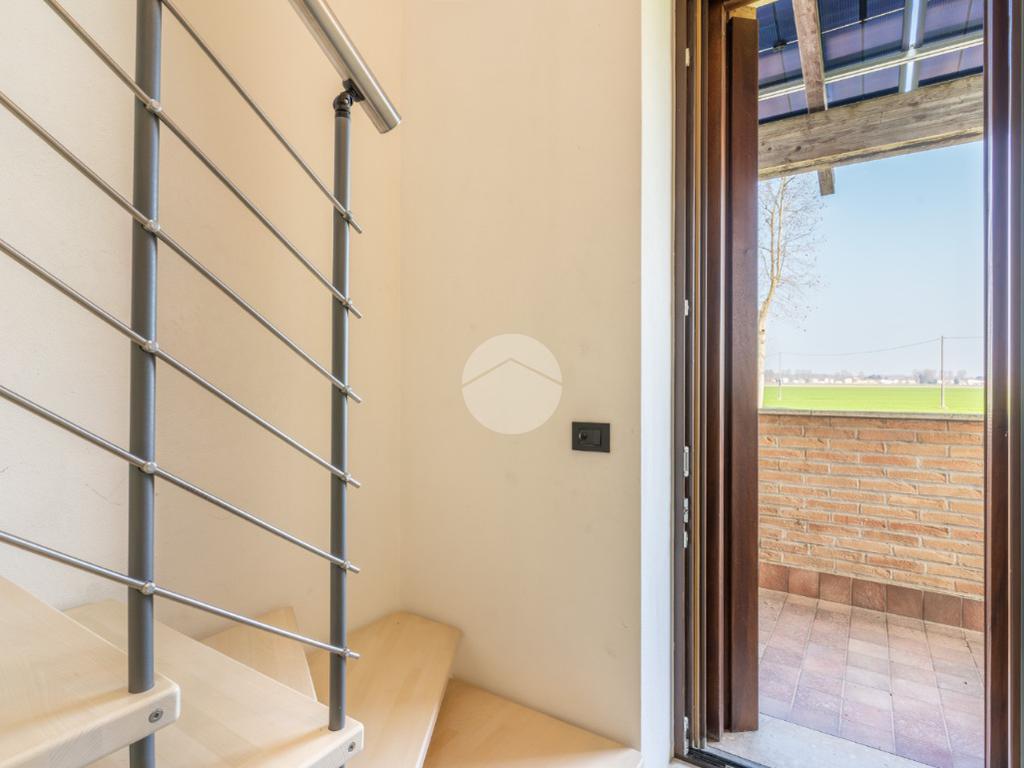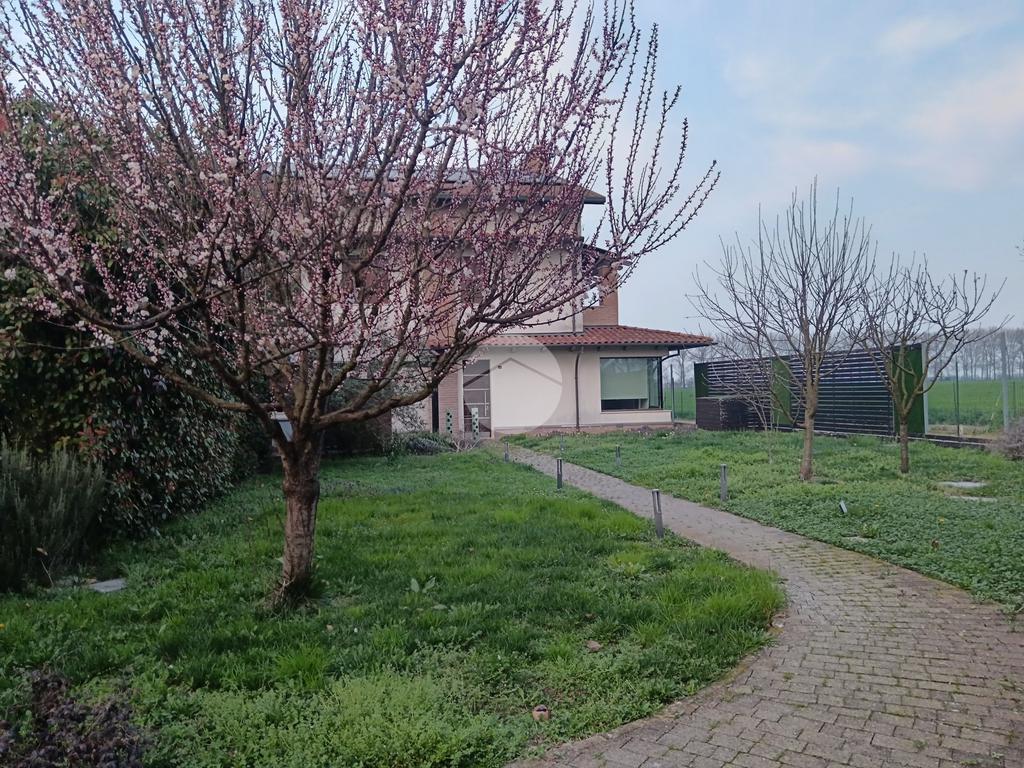 VIGARANO PIEVE: A venti minuti dal centro di Ferrara, e a cinquecento metri dal centro abitato di Vigarano Pieve, proponiamo villa, pari al nuovo, in classe A4, unica nel suo genere, per chi cerca comfort, tecnologia e massima efficienza energetica. Entrando comodamente con l'auto da cancello automatizzato, ci accoglie l'ampia autorimessa completamente indipendente dall'abitazione, completa di accesso pedonale, e l'elegante spazio verde esclusivo di circa 700 metriquadri piantumato, dotato di illuminazione notturna, irrigazione automatica e completato da corsello d'accesso in autobloccante. Comoda anche l'area pranzo esterna allestita con gazebo e pavimentazione in legno, elegante e suggestiva per passare ore serene all'esterno durante la stagione estiva. La casa sviluppa su tre livelli. Al piano terra, la porta blindata apre sul luminoso salone, arricchito da termocamino a legna e da ampie vetrate che affacciano sul giardino. La grande cucina abitabile con zona pranzo accede al giardino tramite comoda porta finestra. Si prosegue con un disimpegno che conduce alla zona antibagno allestita ad uso lavanderia e al bagno con doccia walk in. Salendo la scala di design, si arriva al primo piano dove un meraviglioso ballatoio con pavimentazione in vetro ci conduce alla camera da letto padronale con grande bagno in suite, dotato di doccia e vasca idromassaggio, completa la camera la cabina armadio finestrata. Al piano è presente una seconda camera da letto anche lei dotata di bagno in siute. Passando accanto alla portafinestra che accede al terrazzo, si sale al secondo piano, dove si apre una mansarda open space di quasi 50 metriquadri con predisposizione per il quarto bagno (accatastato). L'immobile ricavato dal recupero di una storica casa colonica con tecniche innovative, è l'unico passivo della provincia di Ferrara e consente un abbattimento quasi totale delle spese di riscaldamento, raffrescamento ed elettricità. (unica bolletta luce circa 150,00 euro/mese). La casa presenta finiture di pregio ed è circondata da imponente siepe sempreverde che garantisce privacy. Le dotazioni impiantistiche, fotovoltaico da 6,2 kWp, 4,8 kW di accumulo, ventilazione meccanica controllata, solare termico, pompa di calore DaiKin. L'immobile non è soggetto a tasse per lo scarico in fognatura ( sistema di subirrigazione autorizzata da ARPA). Libera subito. Contatta per ulteriori informazioni.